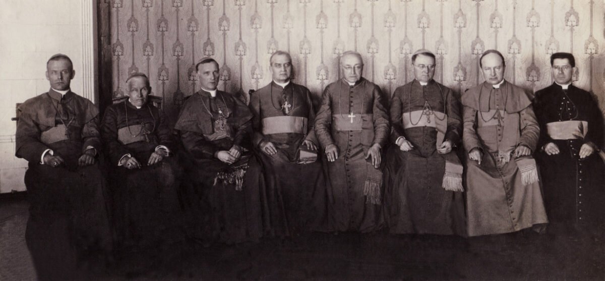 Nuotr. Kauno arkivyskupijos archyvų / 1926 m. Lietuvos bažnytinės provincijos ganytojai (iš kairės): Kazimieras Paltarokas, Antanas Karosas, Juozapas Jonas Skvireckas, apaštalinis vizitatorius Jurgis Matulaitis, Pranciškus Karevičius, Justinas Staugaitis, Juozapas Kukta, Mečislovas Reinys