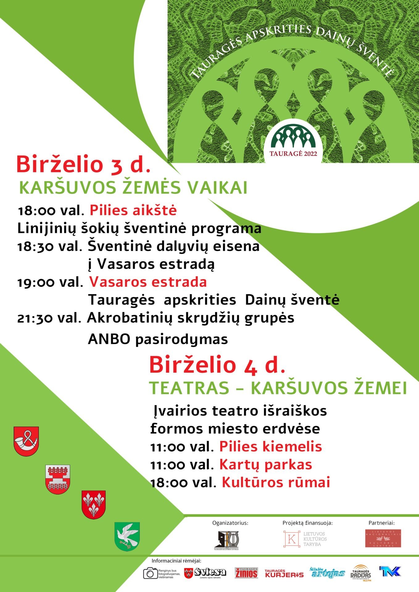 Apskrities Dainų šventė– svarbus Tauragės krašto kultūros įvykis, jungiantis visas kartas ir visus žmones, stiprinantis šalies tapatybę ir garsinantis jos vardą. Mūsų krašto tautines dainas, šokius, ansamblių, pučiamųjų instrumentų orkestrų, kanklių muzikos ir teatro programas, amatus pristatantys atlikėjai 2022 m. birželio 3 d. Tauragėje ištars: „Mes – Karšuvos žemės vaikai“.