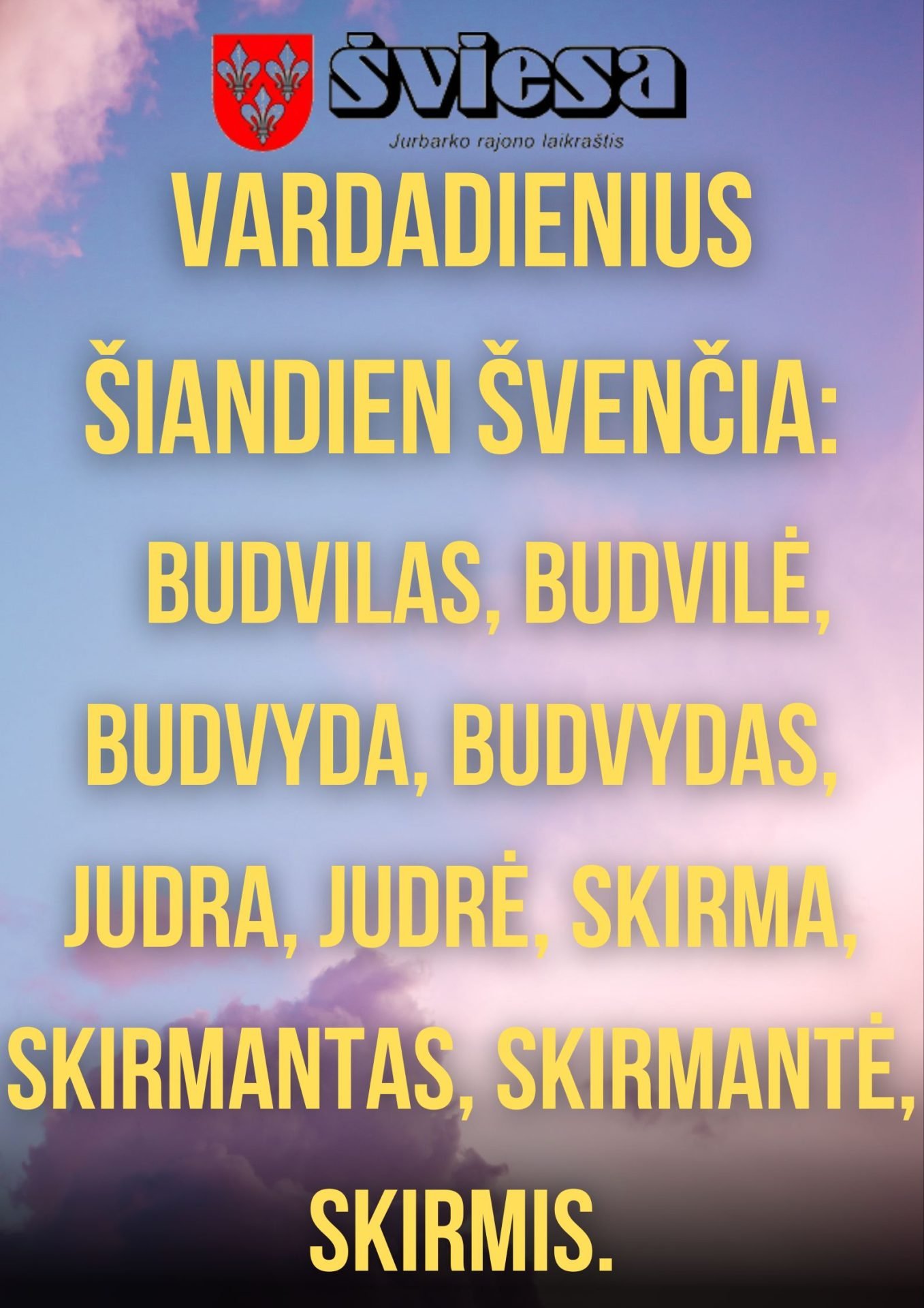 Savo vardadienius antradienį švenčia: Budvilas, Budvilė, Budvyda, Budvydas, Judra, Judrė, Skirma, Skirmantas, Skirmantė, Skirmis;