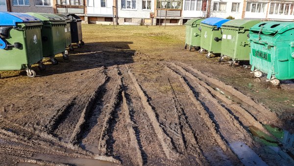 Tačiau klimpsta ne tik gyventojų automobiliai. Problemų turi ir sunki komunalininkų technika, bandanti privažiuoti prie šiukšlių konteinerių. Darbuotojai iki kulkšnių skęsta purve, o sunkvežimis palieka gilias provėžas.