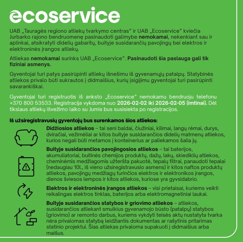 Gyventojai, norintys pasinaudoti nemokamu didžiųjų atliekų išvežimu turi registruotis iš anksto „Ecoservice“ telefonu +370 800 53533. Registracija vykdoma nuo 2026-02-02 iki 2026-02-05 (imtinai).