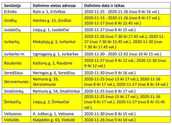 Jurbarko rajono savivaldybės administracija informuoja paramos gavėjus, kad paskutinieji šiais metais maisto produktai ir higienos prekės bus dalinami žemiau nurodytuose punktuose šiomis datomis: