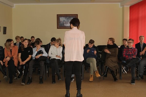 Užsiėmimą vedė Rimanta Vaičekonytė iš VšĮ „Menų ir mokymo namai“. Vedėja aptarė vyraujančias problemas mokykloje, namuose. Tada mokiniai buvo suskirstyti į motyvuotas grupes, kuriose kūrė „Forumo“ teatro mini scenas. Vėliau diskutavo apie galimus pokyčius, atvirai išsakė savo jausmus, mintis apie tai, kas vyksta scenoje, pabandė patys pakeisti kurį nors aktorių ir išbandyti scenoje savo pasiūlymą, ką turėtų padaryti kitaip skriaudžiamas žmogus ar tie, kurie stebi šią skriaudą, kad situacija pasikeistų geresne linkme.
