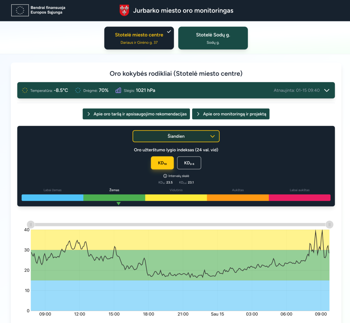 Jurbarko miesto gyventojai jau dabar turi galimybę realiuoju laiku stebėti aplinkos oro kokybę net dviejose miesto vietose. Viešai prieinami duomenys leidžia sekti oro užterštumo lygio indeksą, kietųjų dalelių koncentraciją ore, o taip pat oro temperatūrą, santykinę drėgmę ir atmosferos slėgį.