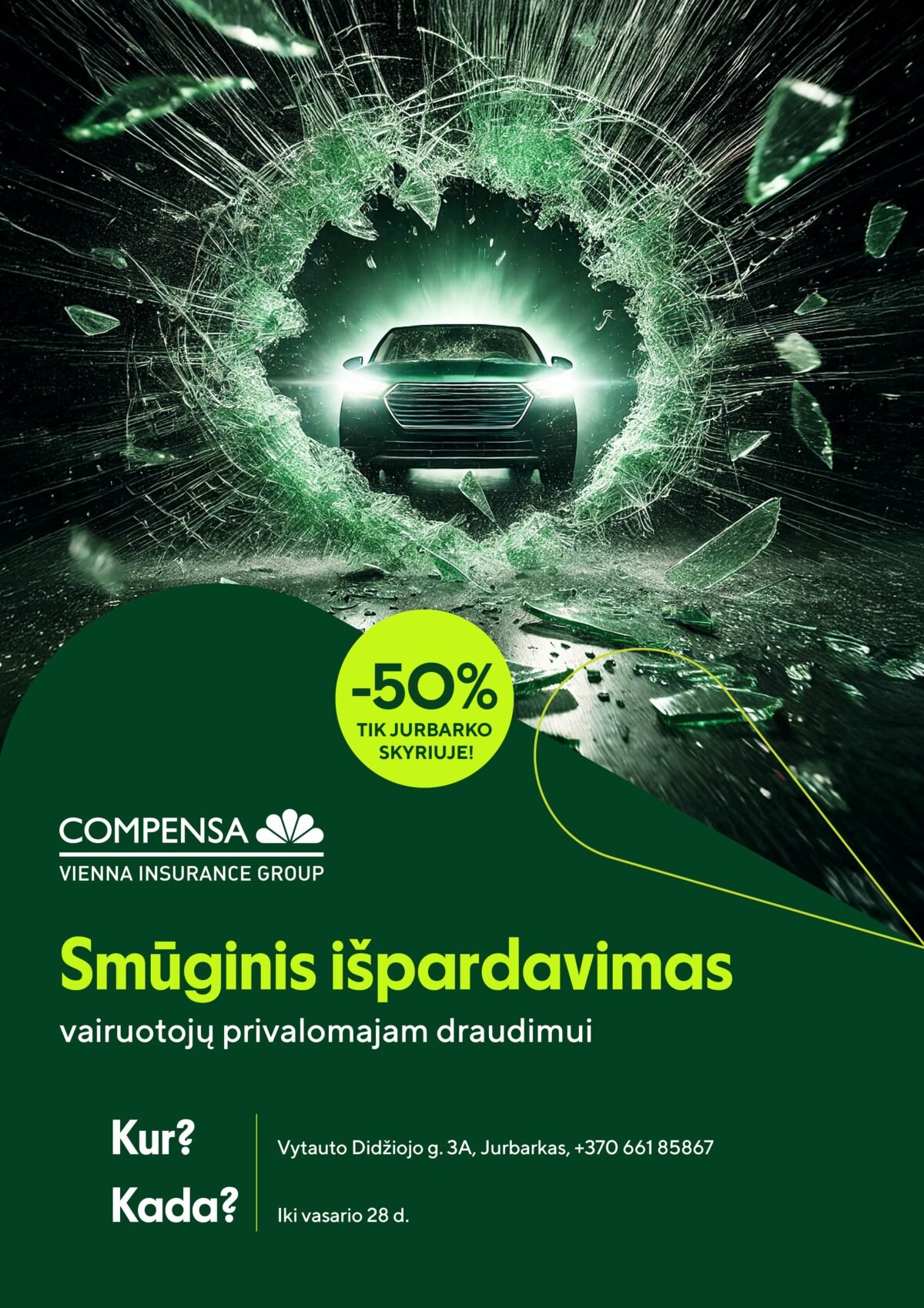 Ypatinga akcija „Compensa Viena Insurance Group“ padalinio Jurbarke atidarymo proga – 50 proc. nuolaida privalomajam automobilių draudimui. Jurbarko padalinio vadovė Evelina Barauskienė kviečia jurbarkiškius ateiti ir pasitikrinti, kiek jiems kainuotų apdrausti savo automobilį.