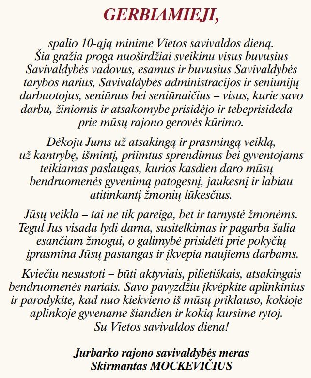 Šia gražia proga nuoširdžiai sveikinu visus buvusius Savivaldybės vadovus, esamus ir buvusius Savivaldybės tarybos narius, Savivaldybės administracijos ir seniūnijų darbuotojus, seniūnus bei seniūnaičius – visus, kurie savo darbu, žiniomis ir atsakomybe prisidėjo ir tebeprisideda prie mūsų rajono gerovės kūrimo.