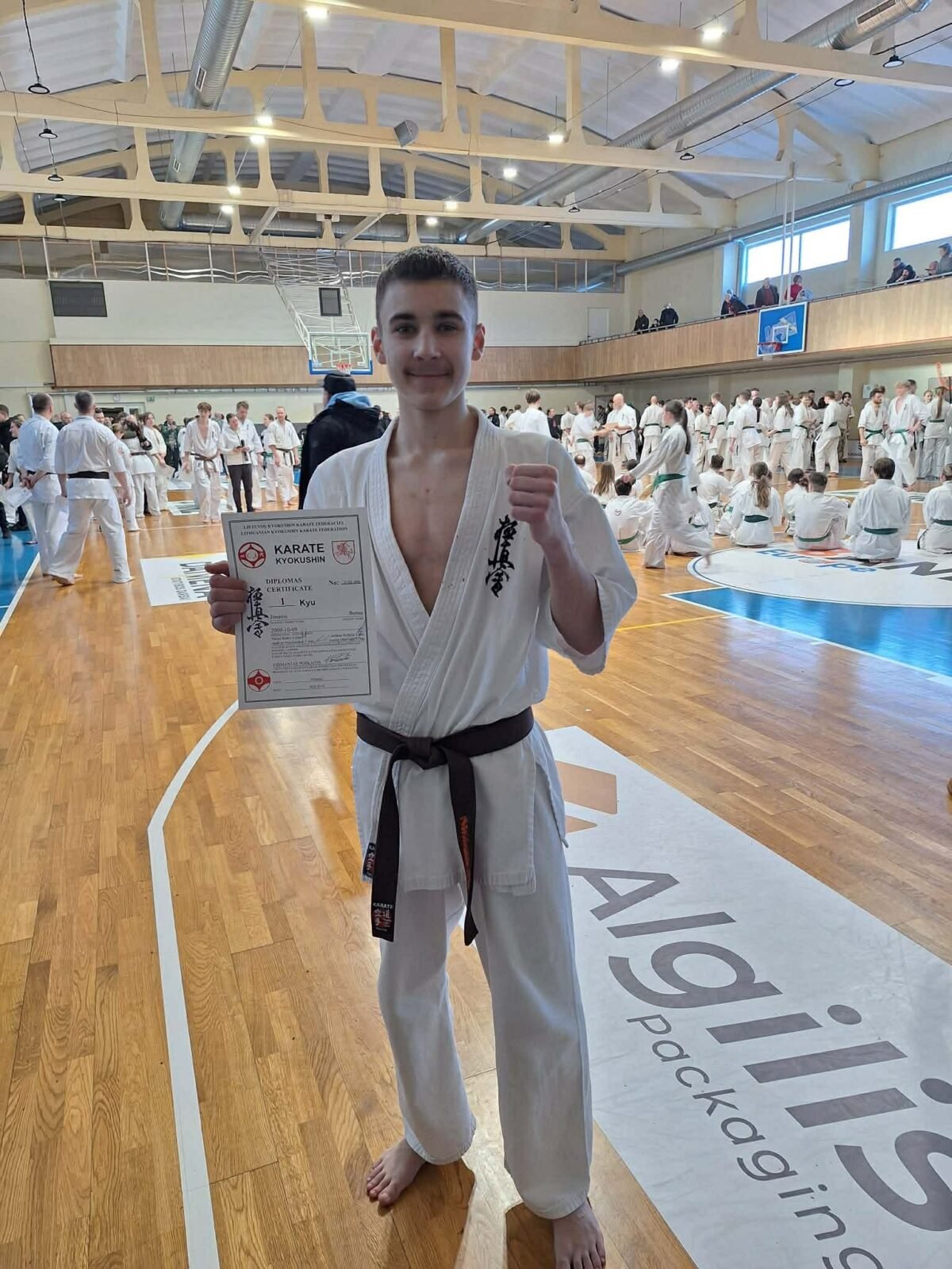 Dar viena džiugi žinia – vasario 1-ąją, sekmadienį, Kėdainiuose vyko kyokushin karate kvalifikacinis diržų gynimo egzaminas. Trenerio Artūro Enčerio ugdytinis Benas Jonaitis sėkmingai išlaikė 1 kyu (rudas diržas su juoda juostele).