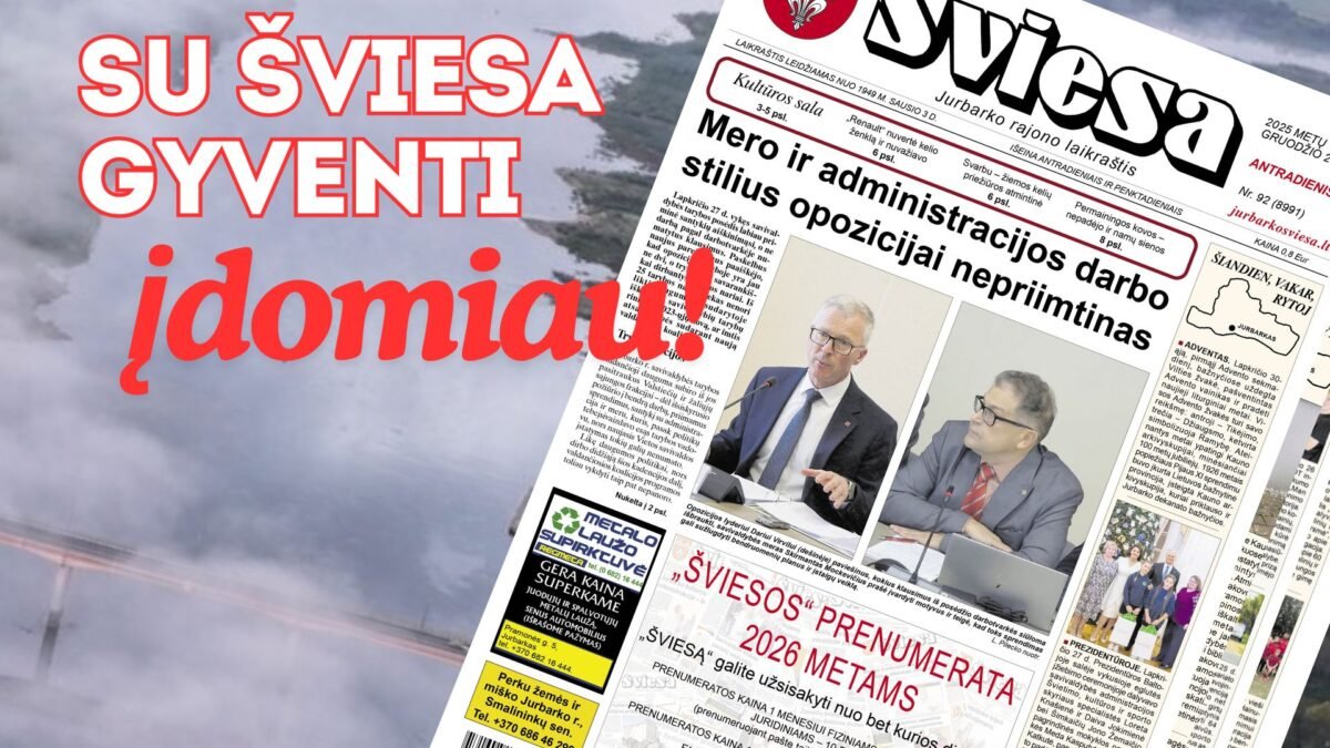 Gruodžio 2-ąją į jūsų rankas atkeliauja naujas Jurbarko rajono laikraščio ŠVIESA numeris. Pirmiausia jis pasieks elektroninę versiją užsisakiusių prenumeratorių pašto dėžutes, vėliau iškeliaus į visą rajoną. O laikraščio neprenumeruojantys skaitytojai ŠVIESĄ, kaip visad, galės įsigyti prekybos vietose.