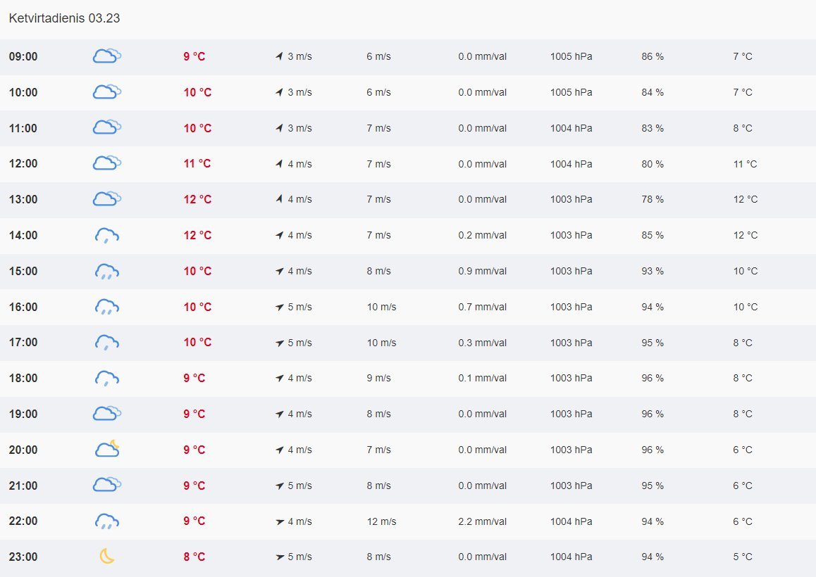 Šiandien daugelyje rajonų lietus. Vėjas pietvakarių, 8–13 m/s. Aukščiausia temperatūra 10–15, vakariniame šalies pakraštyje 7–9 laipsniai šilumos.
