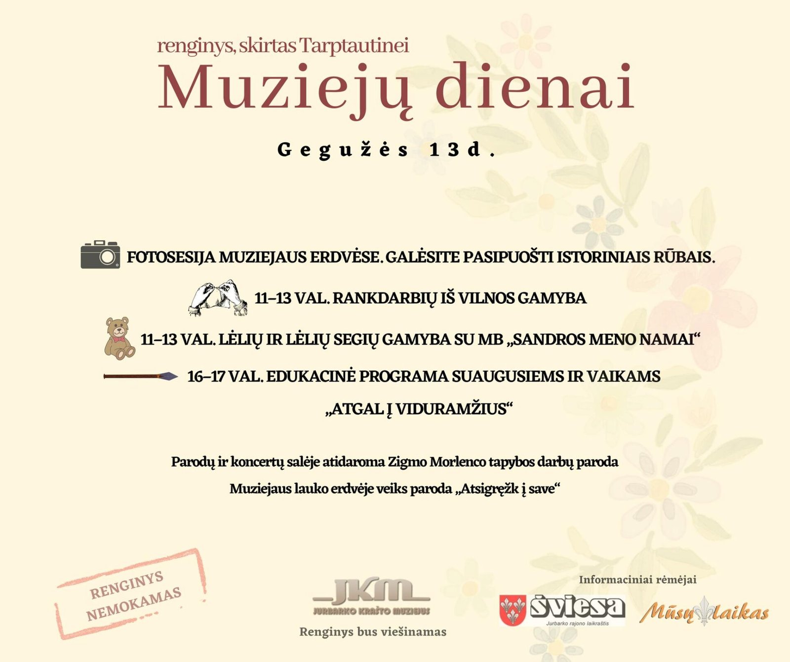 Nuo pat ryto visą dieną muziejaus lauko erdvėje lauks fotografas – visi norintys galės pasipuošti istoriniais rūbais ir nusifotografuoti. Nuo 11 val. iki 13 val. muziejuje MB „Sandros meno namai“ kvies pasigaminti rištinę lėlę ir jų segę. Parodų ir koncertų salėje veiks rankdarbių dirbtuvės – turėsite galimybę susipažinti su vilnos vėlimo technika. Nuo 16 val. visi kviečiami į edukaciją „Atgal į viduramžius“, kuri patiks ir vaikams, ir suaugusiems.