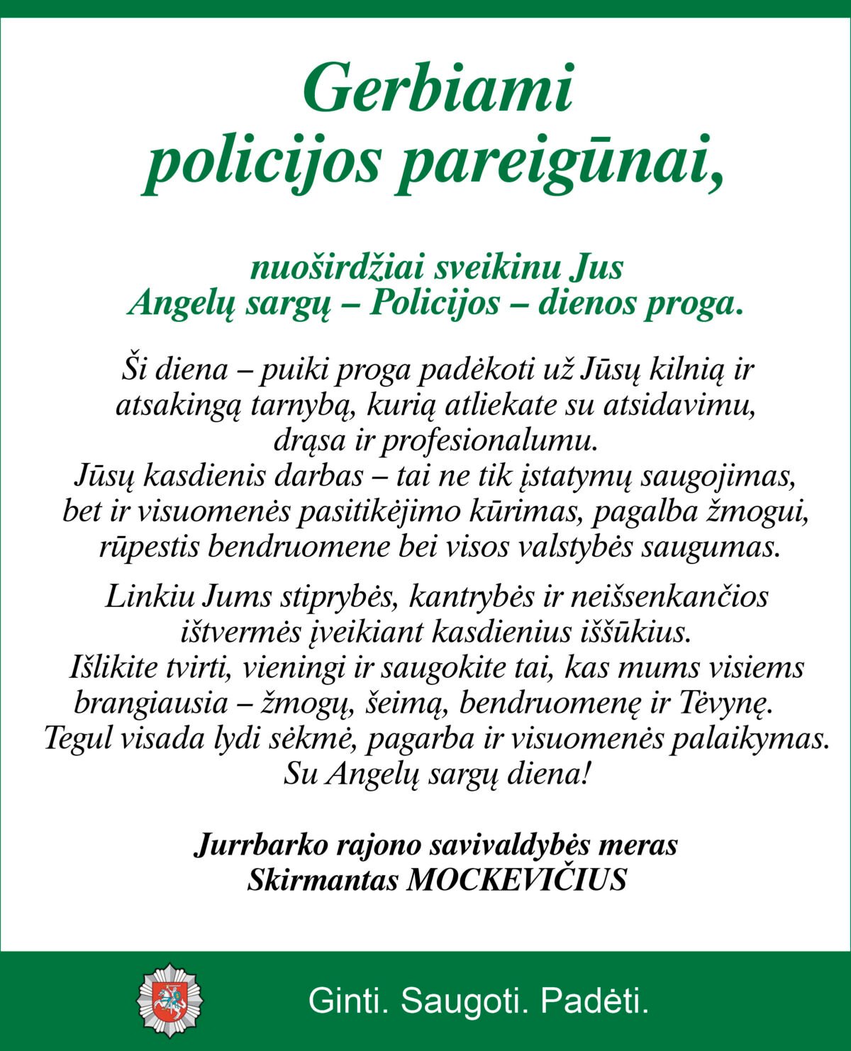 Nuoširdžiai sveikinu Jus Angelų sargų – Policijos – dienos proga.