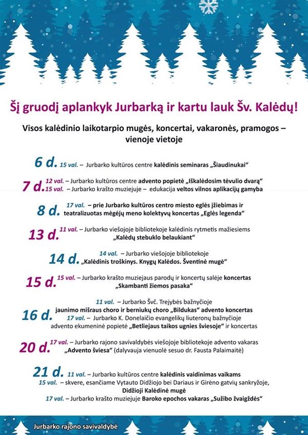 Artėjant gražiausioms metų šventėms, Jurbarko kultūros centras kviečia jurbarkiečius ir miesto svečius įsilieti į prieškalėdinį šurmulį.