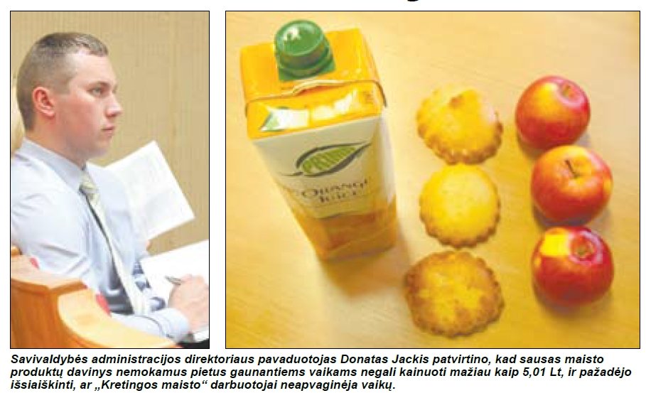 Tokia pedagogų pozicija sunkiai suvokiama. Būdami atsakingi už vaikus mokyklų direktoriai neturi teisės nuleisti rankų ir nieko nedaryti, tačiau nuolat daužyti galva į sieną irgi neįmanoma. Principingą poziciją turėtų užimti savivaldybės administracijos vadovai – juk vien už nemokamiems pietums skirtus produktus pernai savivaldybė „Kretingos maistui“ sumokėjo beveik 1 mln. 170 tūkst. Lt.