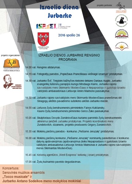 Maloniai kviečiame Jus į Izraelio dienos renginį Jurbarke, kuris vyks 2016 m. spalio 26 d. Jurbarko viešojoje bibliotekoje (Vilniaus g. 4, LT- 74127 Jurbarkas). Renginio pradžia 14.00 val.