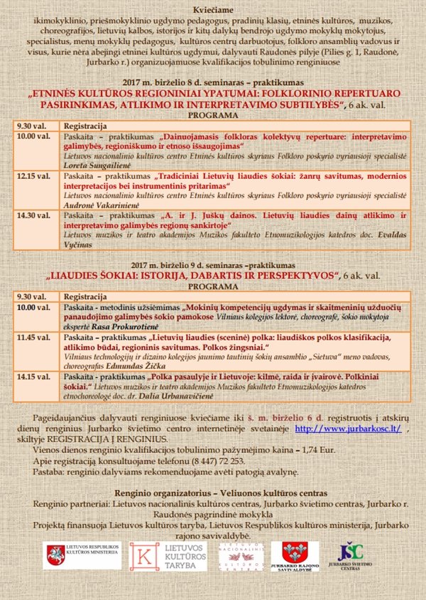 Kviečiame ikimokyklinio, priešmokyklinio ugdymo pedagogus, pradinių klasių, etninės kultūros, muzikos, choreografijos, lietuvių kalbos, istorijos ir kitų dalykų bendrojo ugdymo mokyklų mokytojus, specialistus, menų mokyklų pedagogus, kultūros centrų darbuotojus, folkloro ansamblių vadovus ir visus, kurie nėra abejingi etninei kultūros ugdymui, dalyvauti Raudonės pilyje organizuojamuose kvalifikacijos tobulinimo renginiuose: