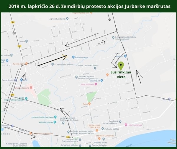Akcija prasidės Eržvilke (informacija tel. 8 610 42 542), Girdžiuose (tel. 8 652 01 736) ir Skirsnemunėje (tel. 8 685 08 275). Iš šių vietų traktoriais atvykę ūkininkai nuo 10 val. iki 10.30 val. lauks bendraminčių prie įvažiavimų į Jurbarką. Vėliau judės į Algirdo g.