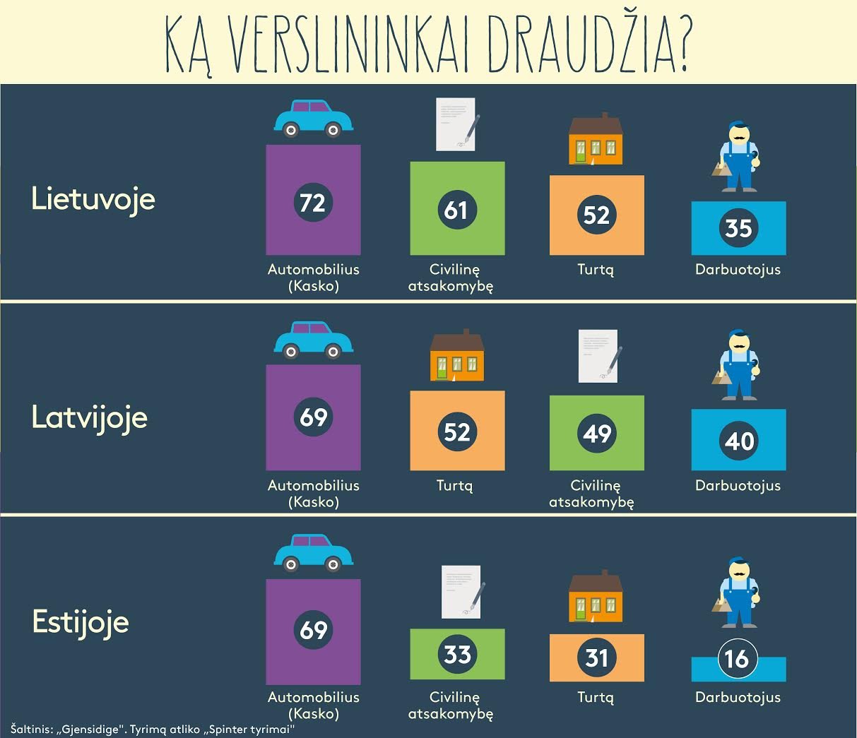 Tyrimo duomenimis, visų Baltijos šalių verslininkų labiausiai saugomas turtas – jų automobiliai. Lietuvos verslininkai, lyginant visus trijų Baltijos šalių vadovus, jais rūpinasi labiausiai – net 72 proc. verslo atstovų kasko draudimu yra apdraudę įmonės transporto priemones. Latvijoje šis rodiklis siekia 69 proc., Estijoje – 67 procentus.