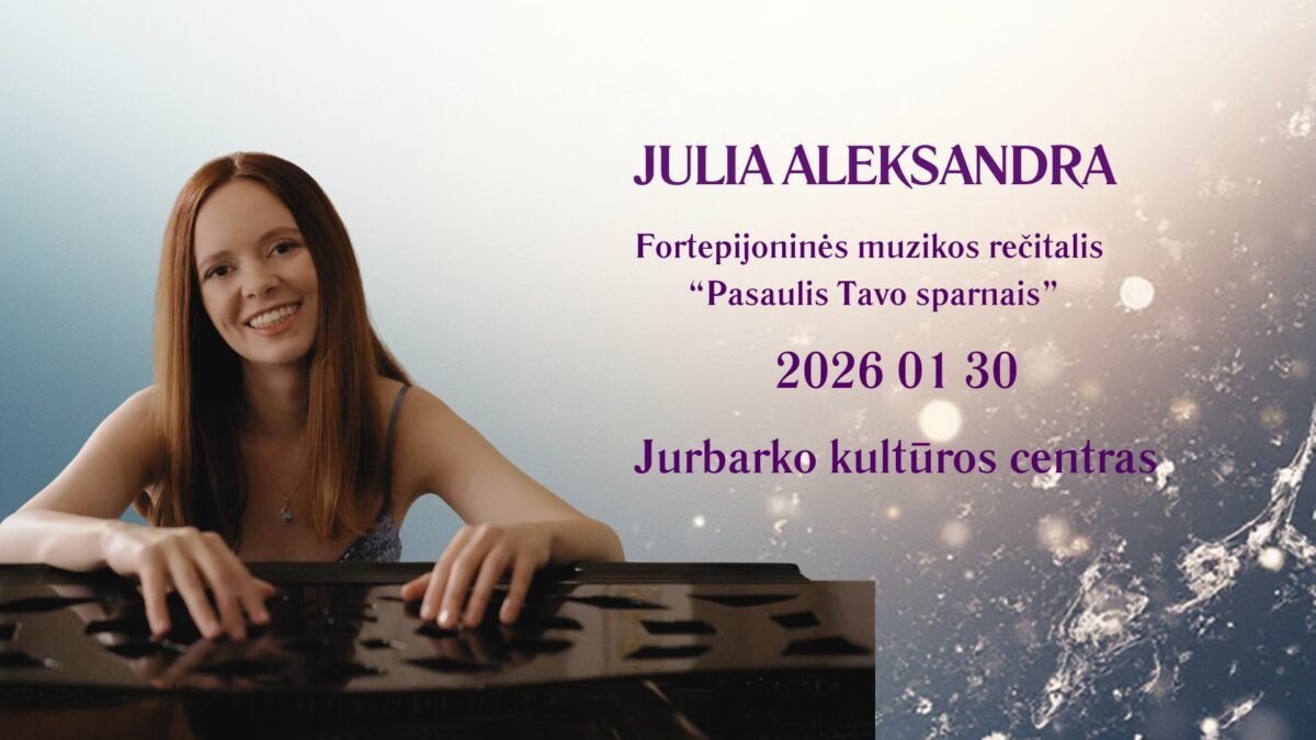 Sausio 30-ąją 18 val. Jurbarko kultūros centre klausytojų laukia Julios ALEKSANDROS fortepijoninės muzikos rečitalis „Pasaulis Tavo sparnais“. Tai viena ryškiausių šiuolaikinės Lietuvos fortepijono scenos asmenybių, savo kūryboje drąsiai jungianti klasiką, šiuolaikinę improvizaciją ir autorinę muziką.