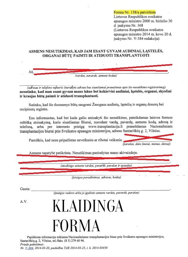 Užpildyti popierinę formą galima kreipiantis į bet kurią asmens sveikatos priežiūros įstaigą; kreipiantis į švietimo, farmacijos ir kitas įstaigas, kuriose patvirtintos pareigybės, reikalaujančios biomedicinos mokslų srities, medicinos, farmacijos, visuomenės sveikatos krypties išsilavinimo (pvz., vaistinės, aukštosios mokyklos ir pan.). Pasirašant nesutikimą, kad žmogaus audiniai, organai po mirties būtų paimti ir atiduoti transplantuoti reikia turėti asmens tapatybę įrodantį dokumentą (pasą, asmens tapatybės kortelę, vairuotojo arba studento pažymėjimą). Jūsų sutikimas/nesutikimas dėl organų donorystės gali būti registruojamas užpildžius tik tas popierines formas, kurios yra pateiktos Nacionalinio transplantacijos biuro internetiniame tinklapyje. Kitos formos nėra priimamos ir registruojamos.