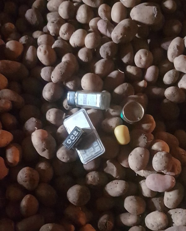 Pagalbinėse patalpose, po bulvėmis, pasieniečių šuo „Baksas“ greitai surado tai, kas taip išmaniai buvo paslėpta. Pareigūnai iš po bulvių kaupo ištraukė stikliniame inde gudriai „užkonservuotas“ galimai narkotines medžiagas (kanapės ir jų dalys stiklainyje buvo užpiltos maltais pipirais), prietaisus narkotinių medžiagų svėrimui ir jų smulkinimui.