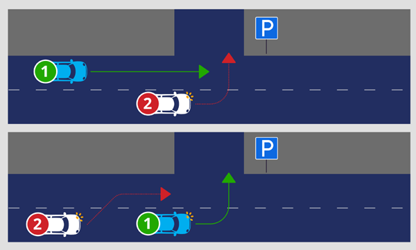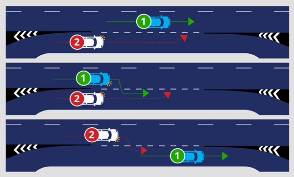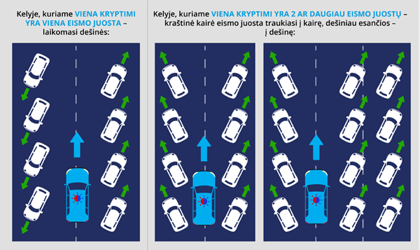 • keliuose su daugiau nei po vieną eismo juostą kiekviena kryptimi – kraštinėje kairėje eismo juostoje esančios transporto priemonės trauksis kairėn, o transporto priemonės, esančios dešiniau, – trauksis dešinėn (taikoma, kai specialios transporto priemonės atvažiuoja ta pačia kryptimi).