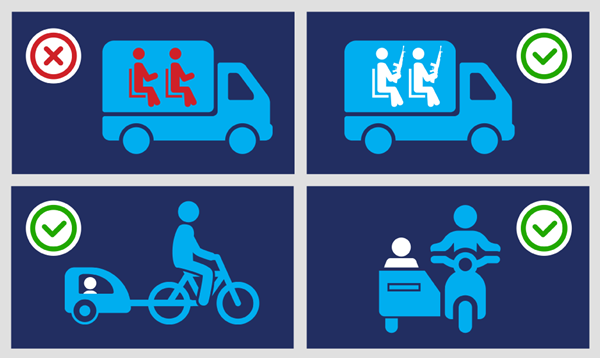 Vežti keleivius krovininio automobilio kėbule eismo saugos požiūriu yra nepriimtina, todėl tokių nuostatų bus atsisakyta. Vežti keleivius krovininio automobilio kėbule draudžiama, išskyrus keleivius, vežamus krašto apsaugos sistemos poreikiams. Vežti keleivius priekabose draudžiama, išskyrus 2 išimtis: keleivius, vežamus motociklų šoninėse priekabose arba tam skirtose dviračių priekabose.