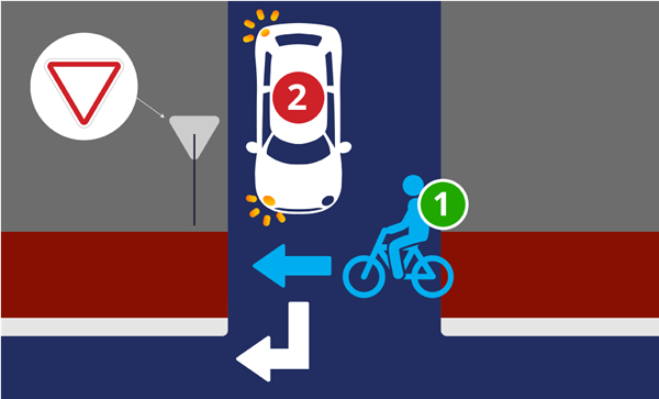 Pakeitimu akcentuojama, kad dviračių tako (ar bendro pėsčiųjų ir dviračių tako) ir važiuojamosios dalies susikirtime, kai yra pirmumo kelio ženklai, eismo dalyviai privalo vadovautis kelio ženklais (pvz., kelio ženklu „Duoti kelią“).