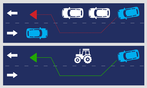Pagal naują tvarką vairuotojas, sukdamas į kairę (apsisukdamas) ne sankryžoje, privalo duoti kelią ne tik priešinga kryptimi tiesiai arba į dešinę važiuojančioms transporto priemonėms, bet ir jį lenkiančioms transporto priemonėms, kai lenkiantysis jau yra persirikiavęs į priešpriešinio eismo juostą ir atlieka lenkimo manevrą, kur toks lenkimas yra leidžiamas.