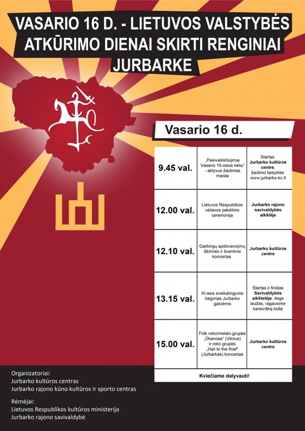 Jurbarke šventė prasidėjo ryte, kai gausus miestiečių būrys susiruošė dalyvauti žaidime „Pasivaikščiok Vasario 16-osios keliu”. Aktyviame ir patriotiniame žaidime dalyvavo aštuonios komandos, kuriose buvo įvairaus amžiaus jurbarkiečių – pradedant vaikais, baigiant suaugusiaisiais.