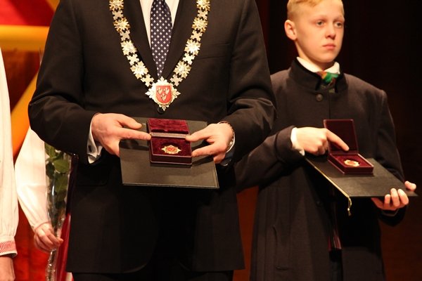 Po Jurbarką pasivaikščioję žaidimo dalyviai, kartu su kitais susirinkusiaisiais Savivaldybės aikštėje iškilmingai pakėlė trisplavę ir sugužėjo į Kultūros centrą. Čia, per iškilmingą ceremoniją, garbės ženklais apdovanoti labiausiai labiausiai kraštui nusipelnę žmonės.