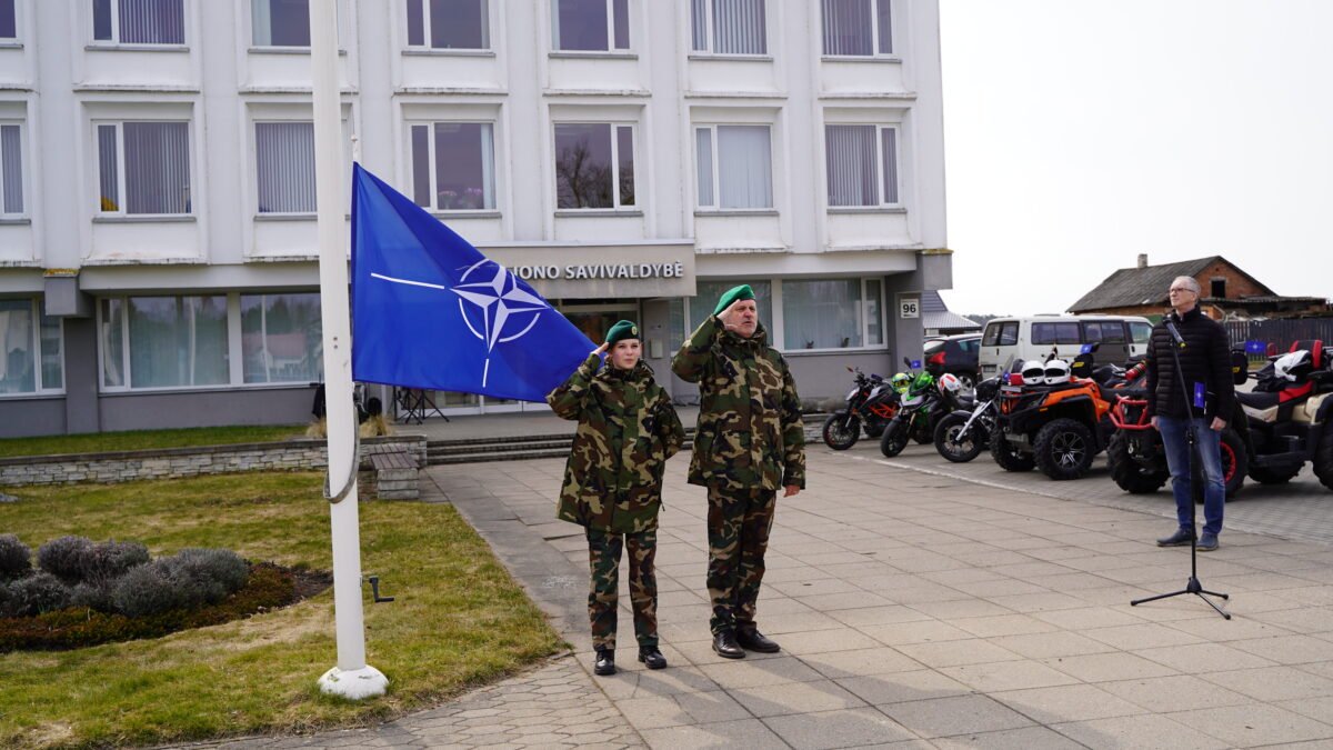 Lietuvai minint 22-ąsias narystės NATO metines, visoje šalyje iškilmingai iškeltos Lietuvos ir NATO vėliavos.