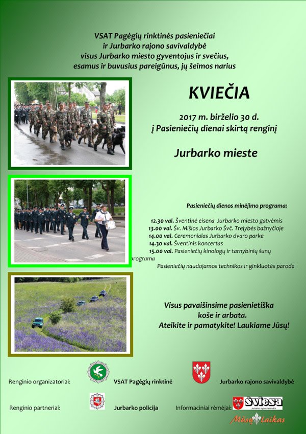 Birželio 30 d., penktadienį, VSAT Pagėgių rinktinės pasieniečiai ir Jurbarko r. savivaldybė visus Jurbarko miesto gyventojus kviečia drauge paminėti Lietuvos pasieniečių dieną ir dalyvauti šventiniuose renginiuose.