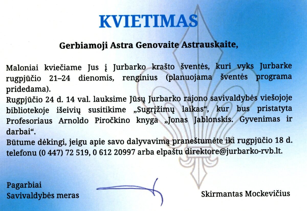 Rugpjūčio 21–25 d. nuaidėjo tradicinė Jurbarko krašto šventė „Sugrįžimų laikas“, kurios dalimi tapo ir viešojoje bibliotekoje vykęs Jurbarko Garbės piliečio prof. Arnoldo Piročkino knygos „Jonas Jablonskis. Gyvenimas ir darbai“ pristatymas. Tačiau renginys virto netikėtu akibrokš- tu, kai scenoje pasirodė kviestinė viešnia, nieko bendro neturinti su pristatoma šviesaus atminimo profesoriaus knyga – viena iš vadinamosios riaušių bylos kaltinamųjų – Astra Genovaitė Astrauskaitė. Kilus visuomenės pasipiktinimui, klaidą pakviesti moterį pripažino ir bendruomenės viešai atsiprašė savivaldybės meras Skirmantas Mockevičius.
