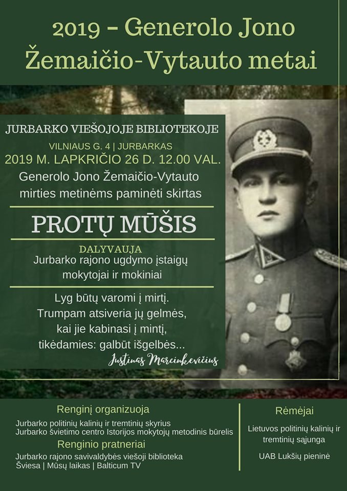 Lapkričio 26-ąją 12 val. Jurbarko viešojoje bibliotekoje vyks generolo Jono Žemaičio-Vytauto mirties metinių paminėjimui skirtas protmūšis.