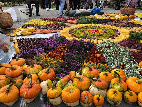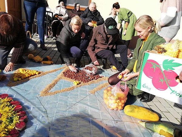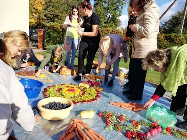 Po sveikinimų visi šventės dalyviai buvo pakviesti čia pat, kieme, iš rudens gėrybių kurti mandalą. Visos trys įstaigos sunešė atsivežtas rudens gėrybes į kiemą ir sukūrė išties nuostabų, spalvingą, nuotaikingą kūrinį. Mandaloje sugulė įvairiaspalvės daržovės – moliūgai, cukinijos, morkos, burokėliai, kukurūzai, bulvės, savo vietą rado riešutai, obuoliai, svarainiai, šermukšniai, kankorėžiai, kaštonai, puošnumo suteikė rudeninės gėlės ir kiti augalai.