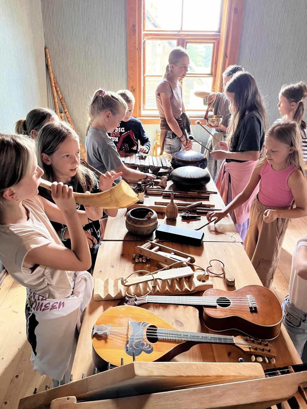 Vaikų dėmesį sutelkti vienai veiklai ilgai nėra paprasta, tarp kūrybinių užsiėmimų buvo žaidžiami judrieji žaidimai. Ypatingas stovyklos akcentas – pažintinė kelionė į Lietuvos etnografijos muziejų Rumšiškėse. Čia stovyklautojai dalyvavo edukacijoje „Muzikuokime kartu“, kuri įtraukė į lietuvių liaudies muzikos pasaulį. Po užsiėmimų jų laukė pietūs kulinarinio paveldo užeigoje, kur vaikai turėjo progos paragauti tradicinių patiekalų.