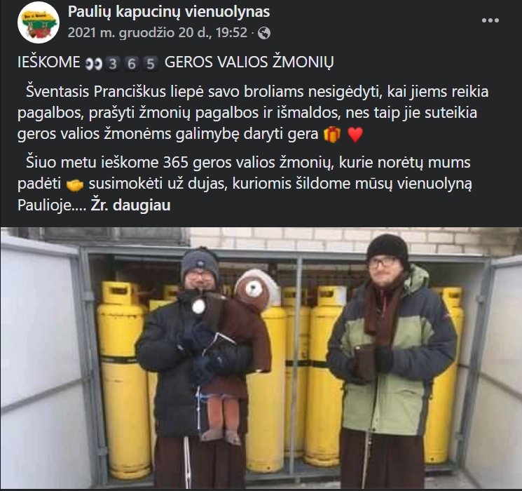 „Šiuo metu ieškome 365 geros valios žmonių, kurie norėtų mums padėti susimokėti už dujas, kuriomis šildome mūsų vienuolyną Pauliuose. Gavome sąskaitą už vienuolynui šildyti reikalingus dujų balionus, kuri šiemet siekia 5616 eurus. Suskirstėme į 365, nes metuose yra tiek daug dienų ir išėjo taip, kad vienai dienai per metus „apšildyti“ reikia 15 eurų“, – savo paskyroje rašė kapucinai.