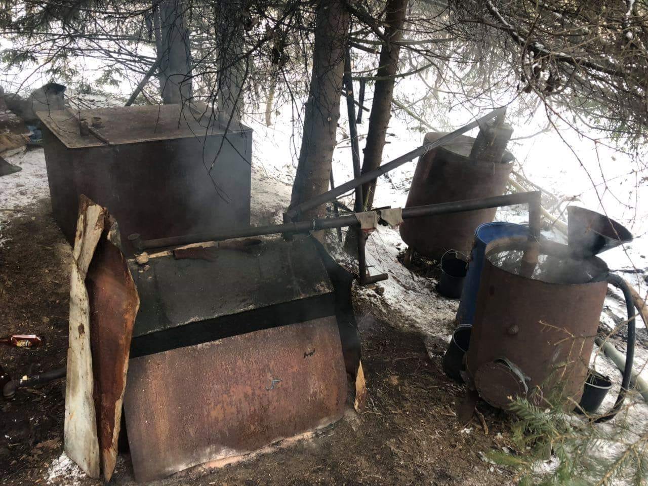 Policininkai degtindarius sulaikė u įkalčiais – rado degtinės varymo aparatą ir 60 litrų specifinį degtinės kvapą tuinčio skysčio.