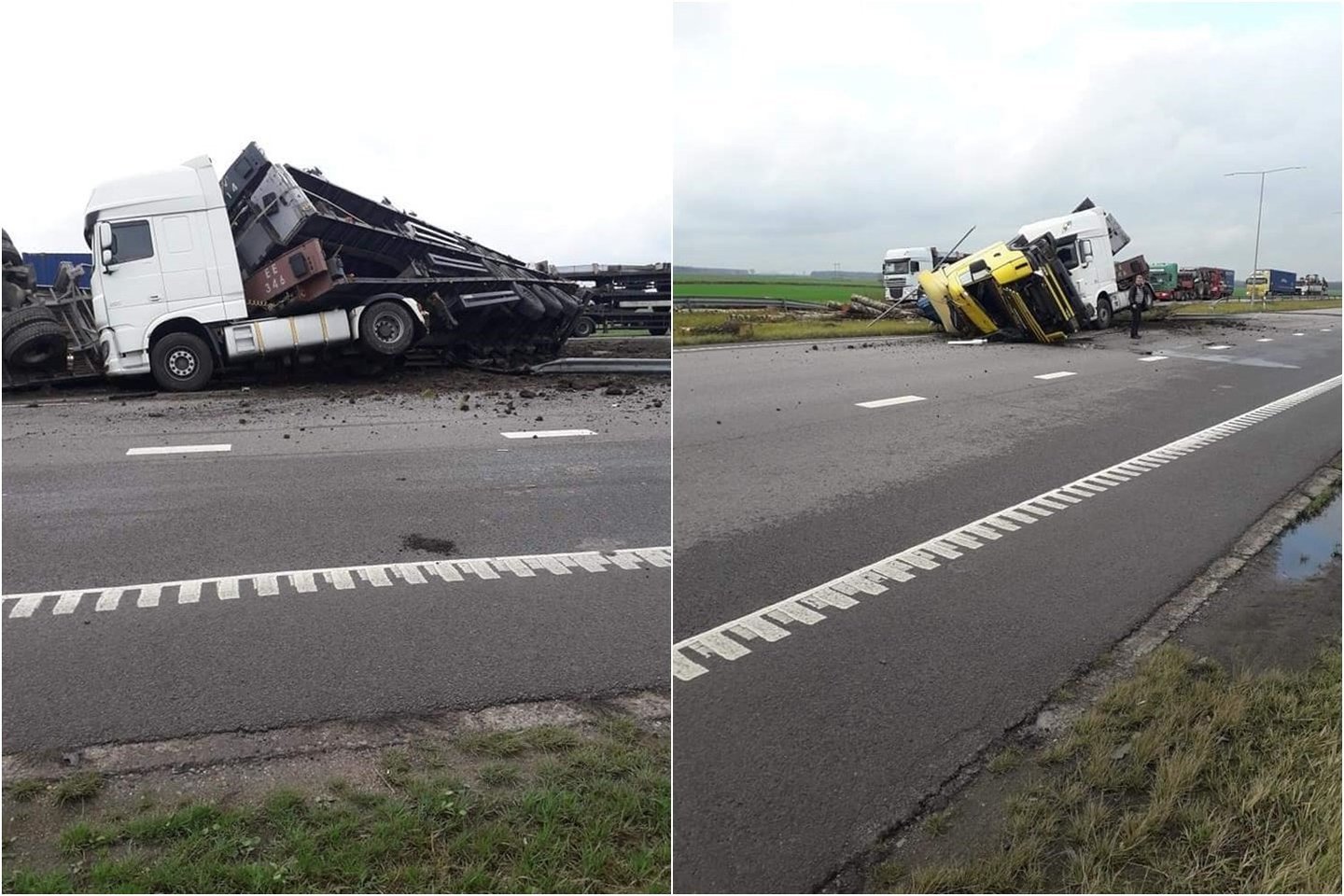 Po susidūrimo vienas vilkikas peršoko atitvarus ir atsidūrė priešingos krypties eismo juostoje.