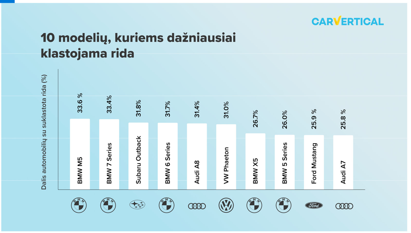 Antrąją ir trečiąją sąrašo vietas užima „7 serijos BMW“ ir „Subaru Outback“ – atitinkamai 33,4 proc. ir 31,8 proc. užfiksuotų ridos klastojimų atvejų. Penktoje vietoje pagal ridos klastojimo dažnumą buvo „Audi A8“, o sportiškesnis jo giminaitis „A7“ užėmė dešimtąją vietą. Šiek tiek daugiau nei ketvirtadalis (25,8 proc.) tokių tyrime dalyvavusių automobilių turėjo priverstinai sumažintą ridą.