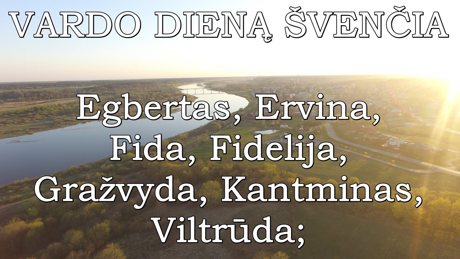 Savo vardadienius šiandien švenčia Egbertas, Ervina, Ervinas, Fida, Fidelija, Fidelis, Fidentas, Fidė, Gražvyda, Gražvydas, Kantmina, Kantminas, Kantminė, Kantrimas, Kantrimė, Kantvainas, Kantvainė, Viltrūda;