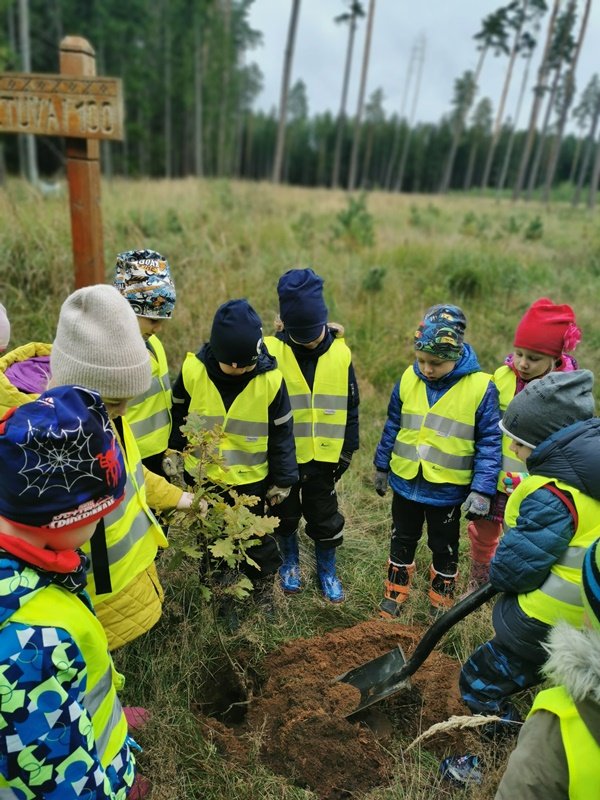 Pirmiausia miške, kuris pasodintas minint atkurtos Lietuvos 100-metį, pasodinome 2 ąžuoliukus ir 15 pušelių. Vaikai miške patys prisirinko giliukų ir su girininko pagalba, naudodami specialų kastuvą, skirtą medeliams sodinti, kiekvienas pasodino po vieną ar du giliukus.